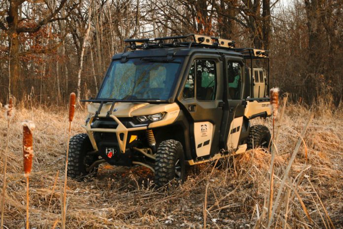 In addition to the Defender Max Limited’s 82hp/69lb-ft Rotax 976cc engine, 2,500lb towing capacity and fully enclosed cab featuring auto-heating and air-conditioning, the vehicle features a complete overhead audio system, Can-Am LinQ Tool and Gun Holder, Can-Am Adventure Roof Rack, a custom bed-box with sliding drawers, 32″ tires with matching wheels, custom powder coating, custom wrap and more. It has an estimated value of $50,000 after all the accessories and custom work was completed.