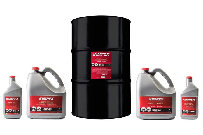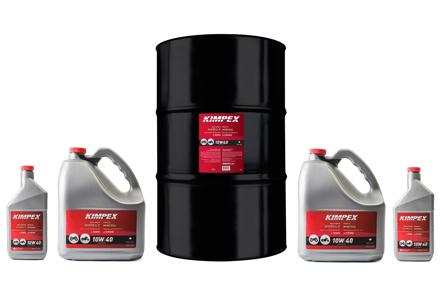 Available in both Synthetic and mineral formulas Kimpex offers their blends of 10W-40 in sizes ranging from 946ml (1qt) bottles, 3.78L (1.79 Gal) jugs and 208L (54 Gal) drums.